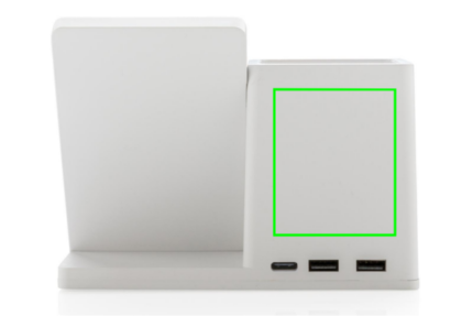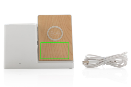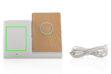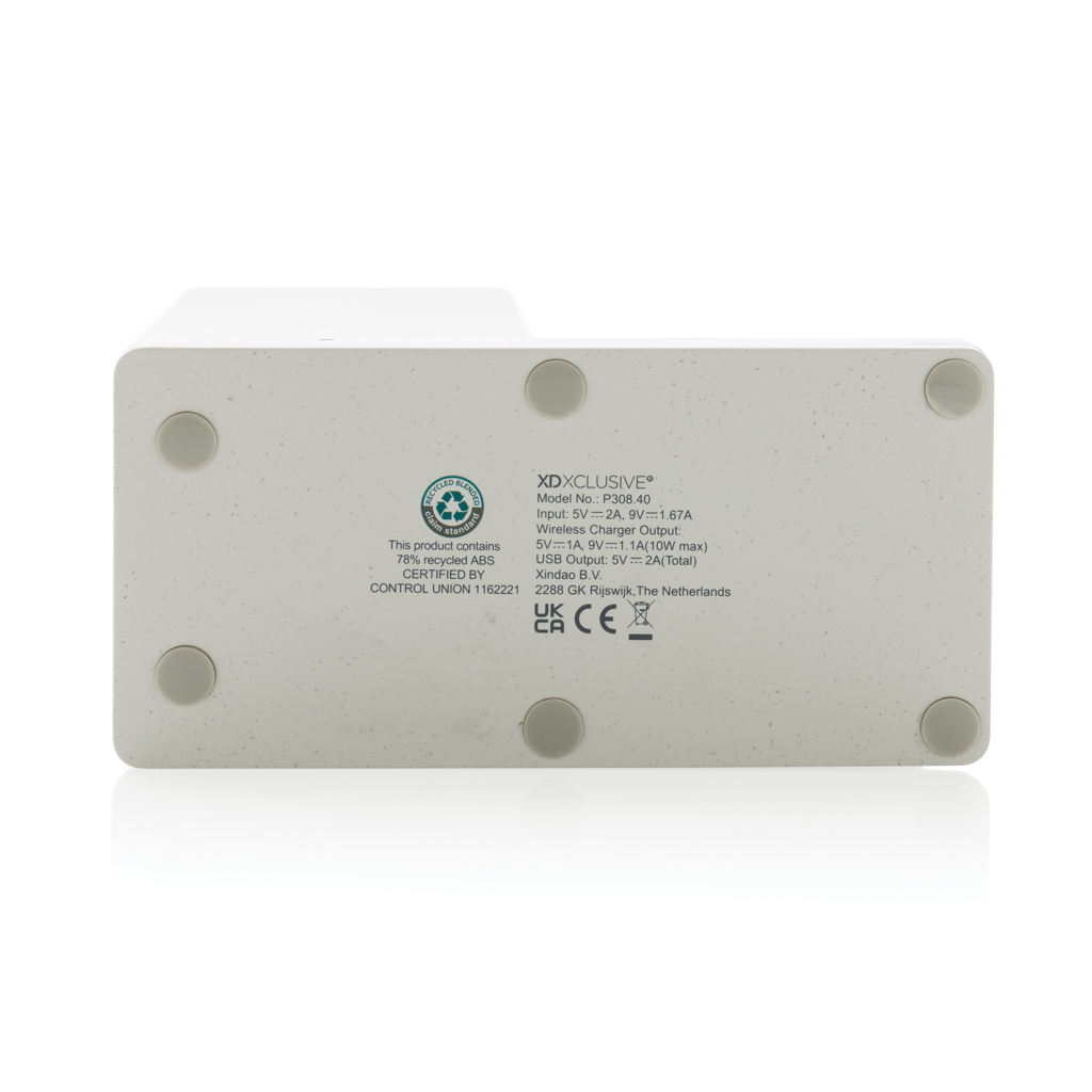 10W fast wireless charger with pen holder made with RCS (Recycled Claim Standard) certified recycled ABS. Total recycled content: 78% based on total item weight. RCS certification ensures a completely certified supply chain of the recycled materials. Bamboo wireless charging area made from FSC 100 bamboo. With two USB ports on the back to charge via cable. Wireless charging compatible with Android latest generations, iPhone 8 and up. Item and accessories PVC free. Including 120 cm type C charging cable made from RCS certified recycled TPE. Packed in FSC mix kraft box. Type-C Input 5V/2A; 9V/2A; Wireless output 5V/1A;9V/1.1A; (10W) Registered design®