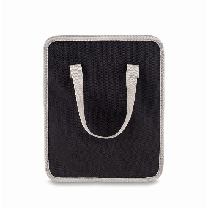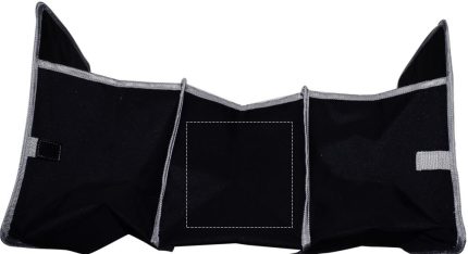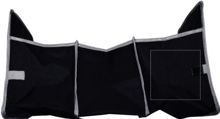 Foldable car organizer in 600D polyester with mesh pocket on side. When not in use, you can fold this up for compact storage. Also, this makes driving safer as it will prevent items from possibly rolling under the drivers feet.