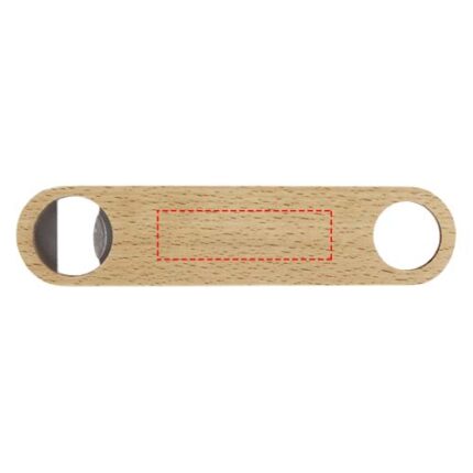 Bottle opener made of stainless steel with wooden surface. Features a hanger on the handle.
