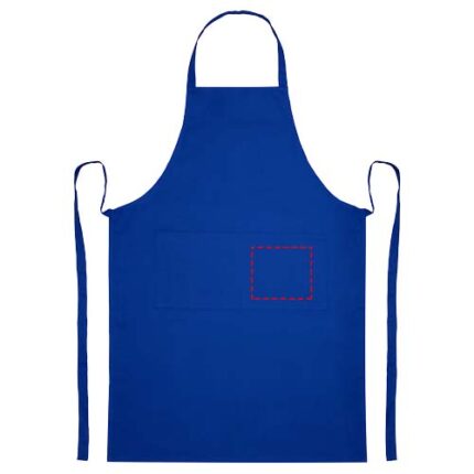 Sustainable apron made of 200 g/m² GOTS certified organic cotton. Features 2 adjacent pockets with a combined size of 45 x 20 cm, and a 1 metre tie back closure. Length of the neck strap: 55 cm.