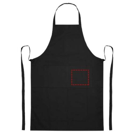 Sustainable apron made of 200 g/m² GOTS certified organic cotton. Features 2 adjacent pockets with a combined size of 45 x 20 cm, and a 1 metre tie back closure. Length of the neck strap: 55 cm.