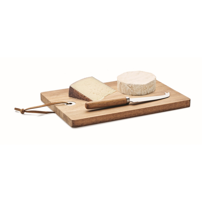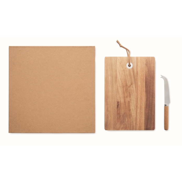 Acacia wood cheese board with knife. Presented in corrugated carton giftbox. Wood is a natural product, there may be slight variations in colour and size per item, which can affect the final decoration outcome.