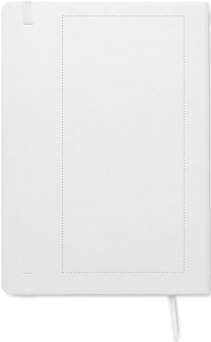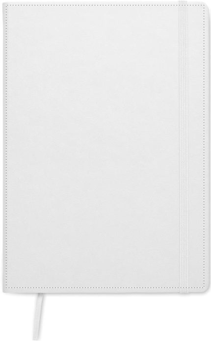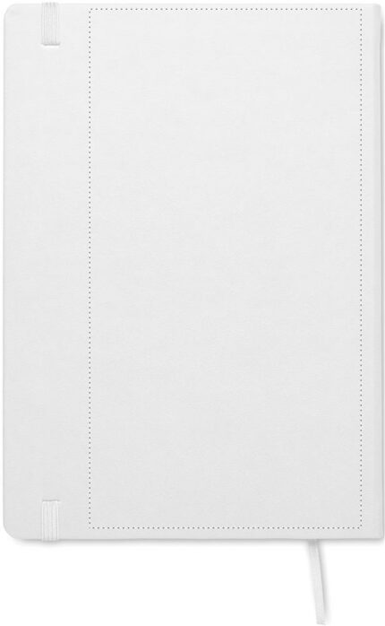 A5 notebook with hard PU cover. Casebound. 200 lined pages (100 sheets) in recycled paper (80 gsm). Matching elastic closure strap and ribbon page-marker. Made in EU.