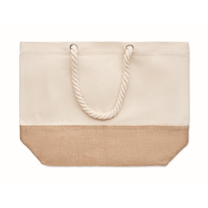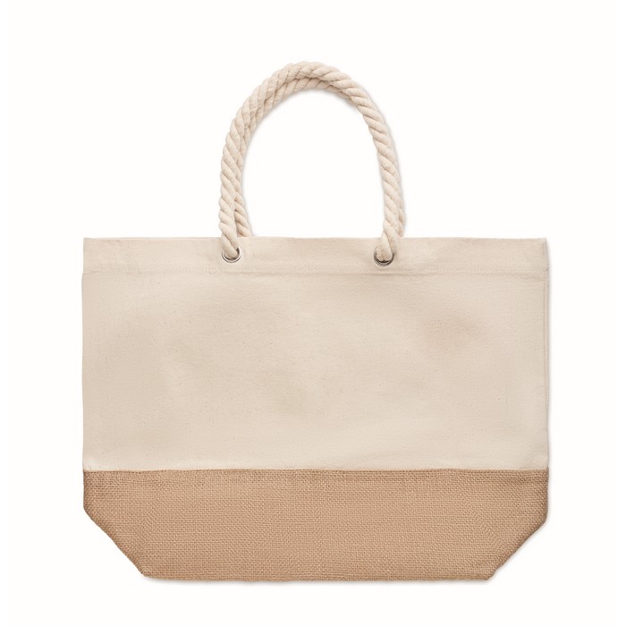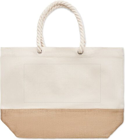 Beach bag or shopping bag in canvas with cord handle and jute detail. 280 gr/m².