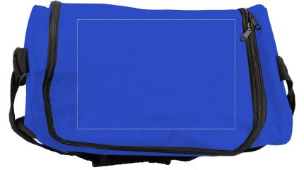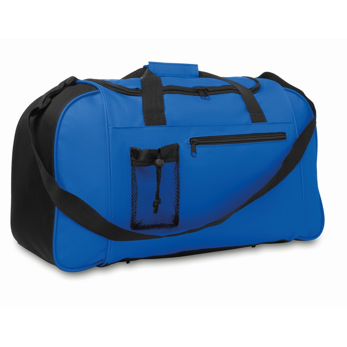 Bright coloured sport or travelling bag in 600D polyester with front pocket and adjustable and detachable shoulder strap.