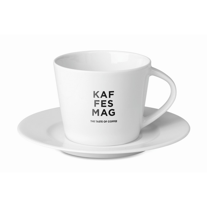 Porcelain conic cappuccino cup with saucer. Cup capacity: 180 ml. Bulk packaging. Pad printing is not dishwasher safe. Ceramic transfer is dishwasher safe.
