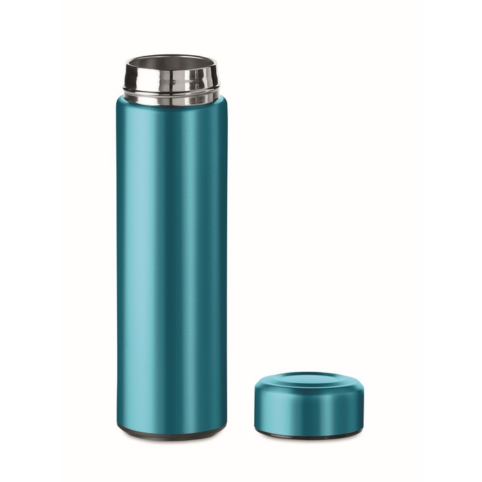 Double wall stainless steel insulating vacuum flask with additional tea infuser. Capacity 425 ml. Leak free.