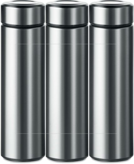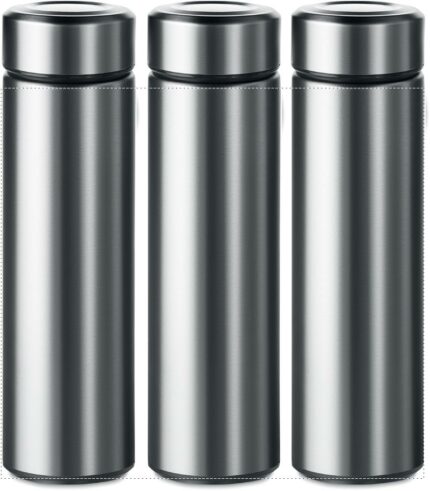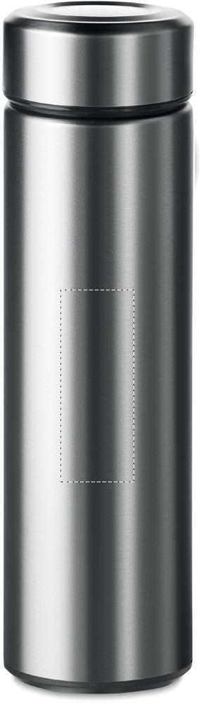 Double wall stainless steel insulating vacuum flask with additional tea infuser. Capacity 425 ml. Leak free.