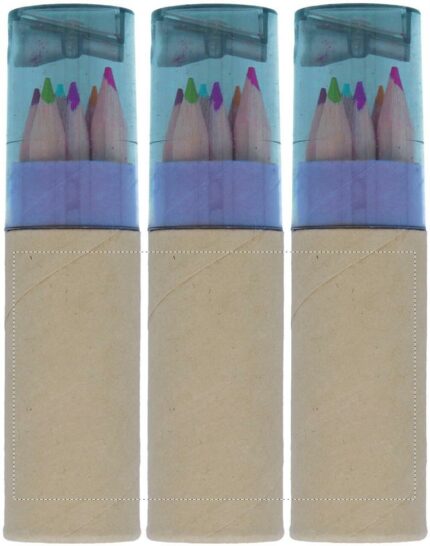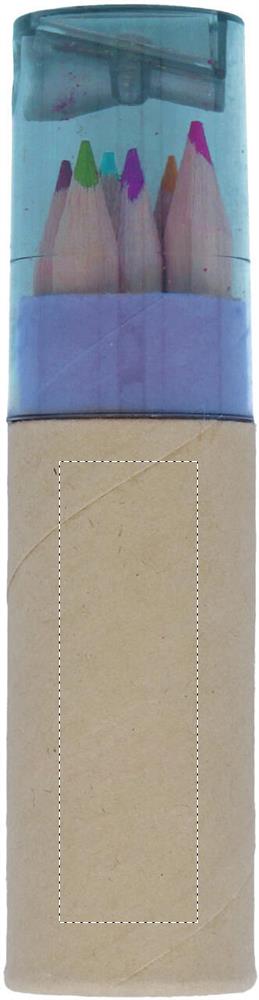 6 piece colouring pencils in tube. Pencil sharpener transparent lid.