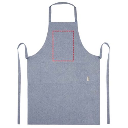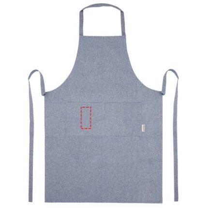 Apron made of 200 g/m² recycled cotton polyester blend. Features 2 adjacent pockets with a combined size of 45 x 20 cm, and a 1 metre tie back closure. Recycled cotton is manufactured from pre-consumer waste generated by textile factories during the cutting process. Due to the nature of recycled cotton, there may be a very slight colour variation. This feature distinctly adds to a more authentic appearance. Length of the neck strap: 55 cm.
