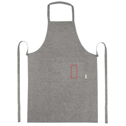 Apron made of 200 g/m² recycled cotton polyester blend. Features 2 adjacent pockets with a combined size of 45 x 20 cm, and a 1 metre tie back closure. Recycled cotton is manufactured from pre-consumer waste generated by textile factories during the cutting process. Due to the nature of recycled cotton, there may be a very slight colour variation. This feature distinctly adds to a more authentic appearance. Length of the neck strap: 55 cm.