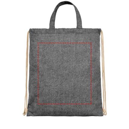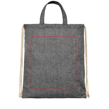 Drawstring backpack made of 210 g/m² recycled cotton polyester blend. Recycled cotton is manufactured from pre-consumer waste generated by textile factories during the cutting process. Large main compartment with cotton drawstring closure. Features two handles with a dropdown height of 14 cm. Resistance up to 5 kg weight.