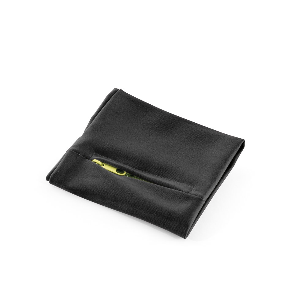 Elastic polyester cuff with zipped pocket, ideal for storing small items and using during sports. 100 x 100 mm