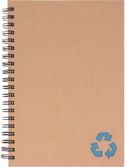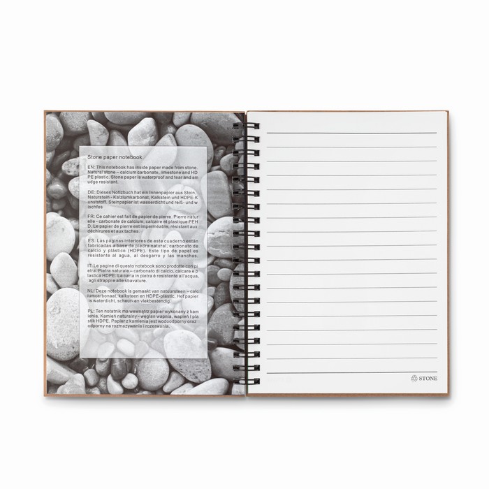 Recycled carton cover notebook. Twin-wire. 140 lined stone paper pages (70 sheets). Stone paper is made out of limestone (calcium carbonate) and HDPE (polyethylene resin) used as a binder. It is waterproof and resistant to grease.