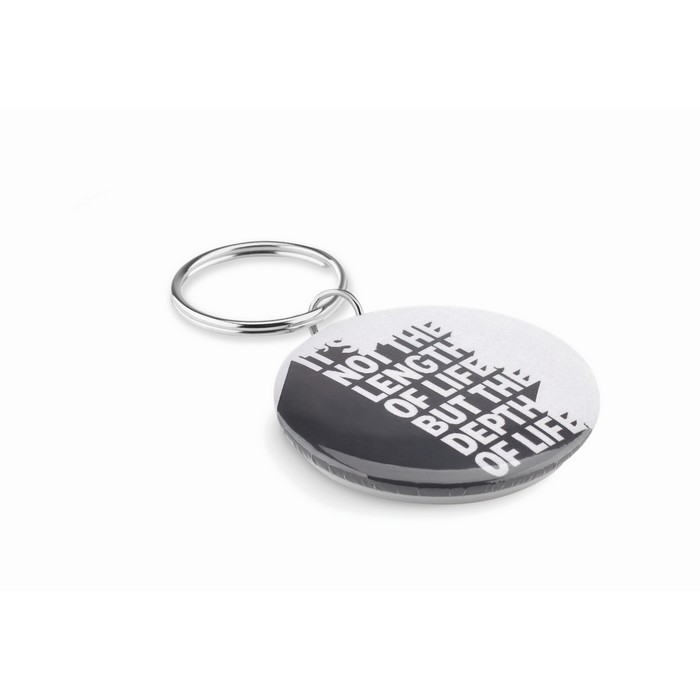 Key ring pin button with paper inlay. Ø4,4 CM. Minimum order quantity 25 pieces. For unprinted orders the item comes unassembled.