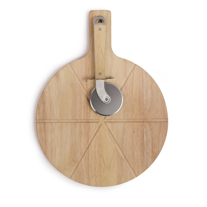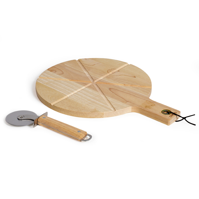 Ένα ξύλινο Pizza set με ένα pizza cutter, με εκτύπωση και ως ε