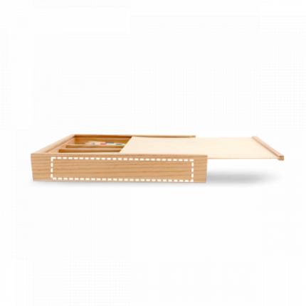 Family game set: 4 in 1. This wooden box includes: domino, mikado, a deck of cards and dice. 190 x 138 x 31 mm