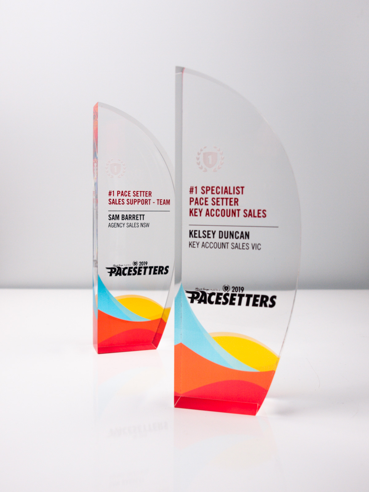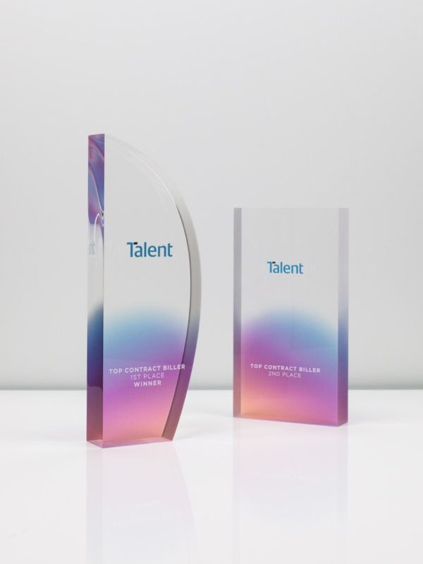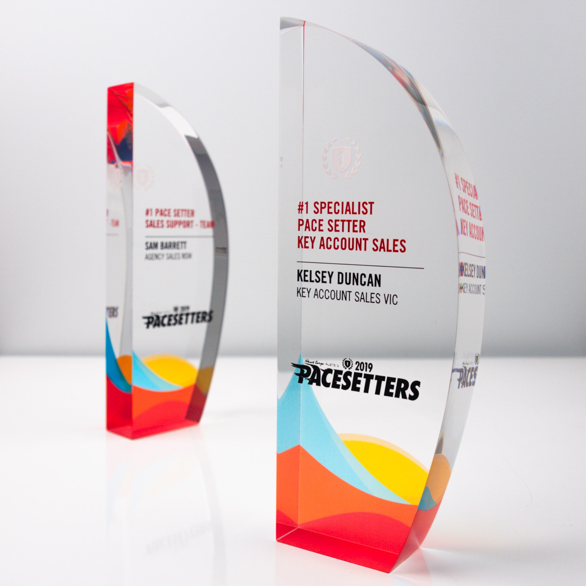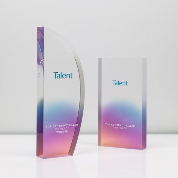 Plexiglass πλακέτα 18cm ύψος από A’ ποιότητας plexiglass πάχους 2 cm. Διάφανο plexiglass με εκτύπωση full color στην πίσω πλευρά και χάραξη laser λογοτύπου/κειμένου στην μπροστινή πλευρά για αίσθηση 3D.
