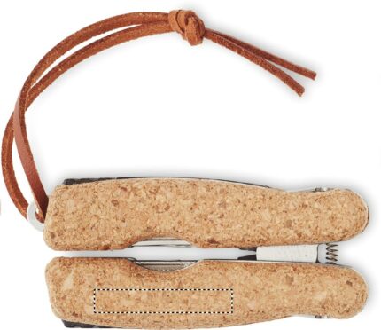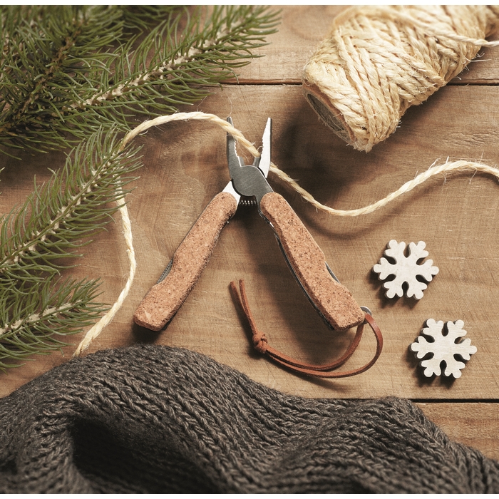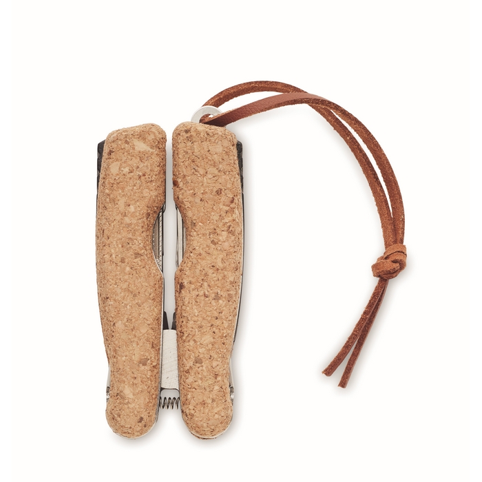 Stainless steel multi-function pocket knife with a cork cover and PU handle cord. 9 functions. It includes: Pliers, 2 openers, screwdriver with Philips bits, saw blades, knife, file and screwdriver with flat bit. Cork is a natural product, there may be slight variations in colour and size per item, which can affect the final decoration outcome.