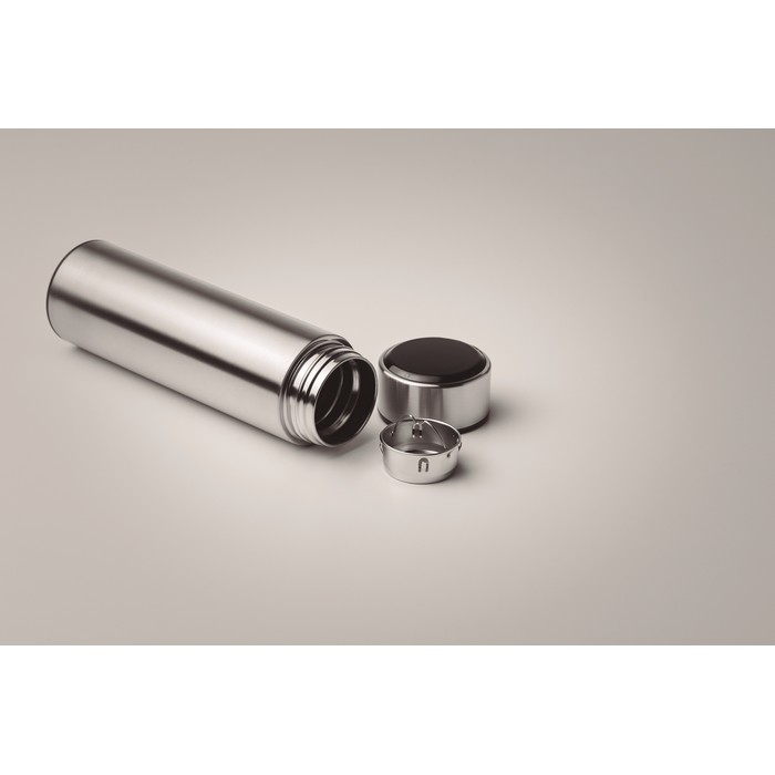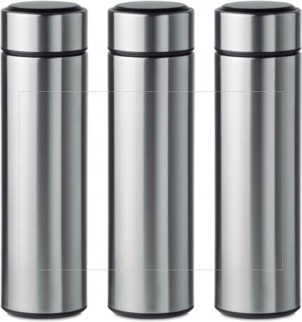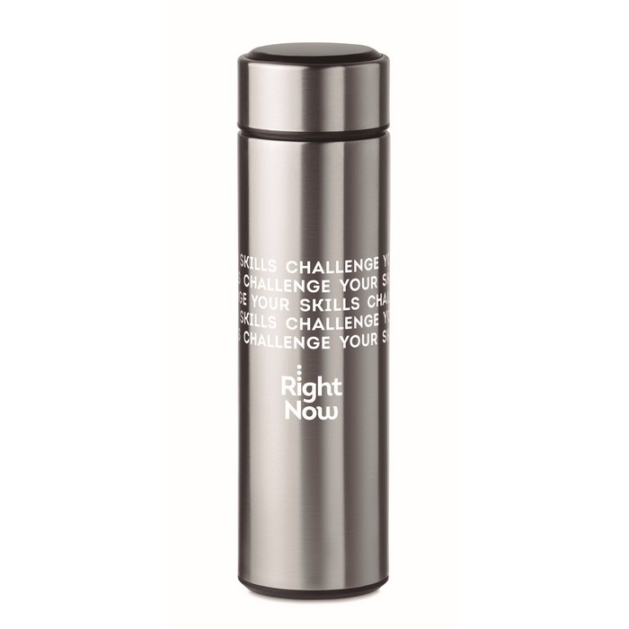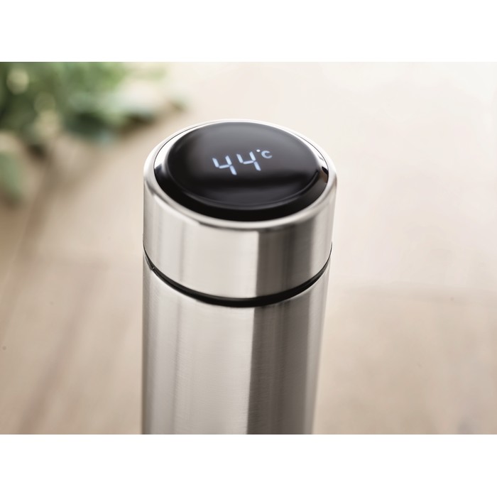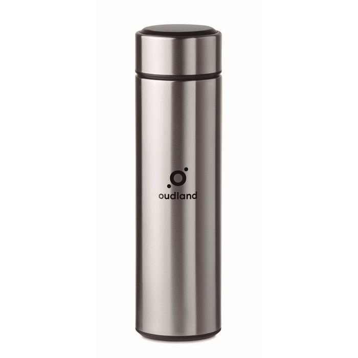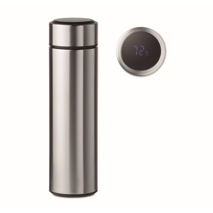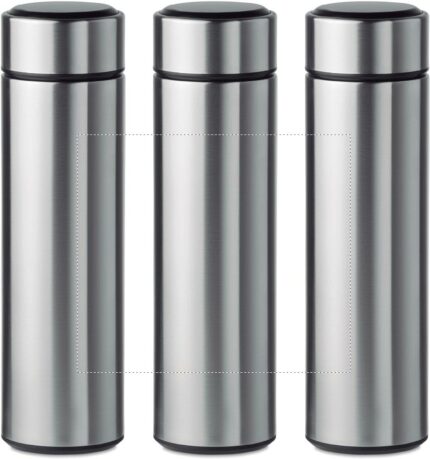 Double wall stainless steel insulating vacuum bottle. It has an LED touch thermometer incorporated in to the top of the lid and tea infuser inside. 1 replaceable CR 2450 battery included. Leakproof. Capacity: 450 ml. Leak free.