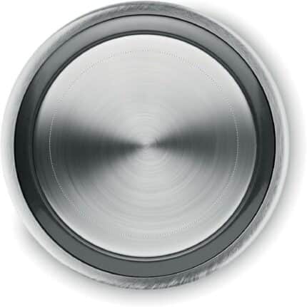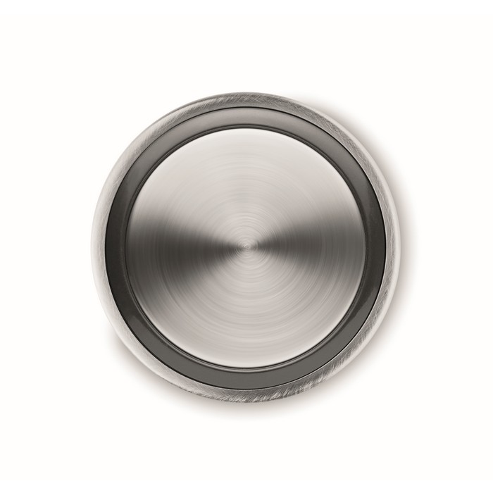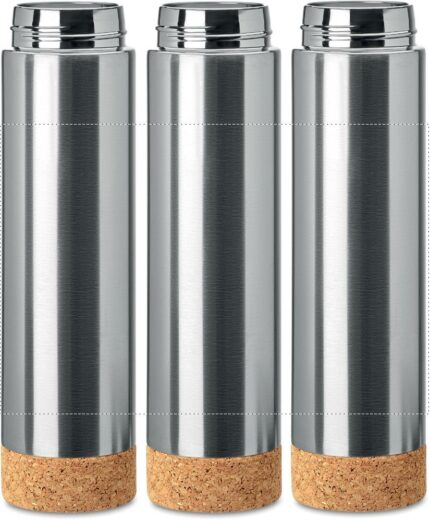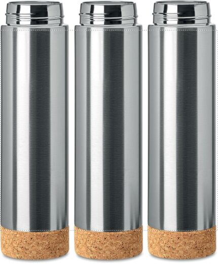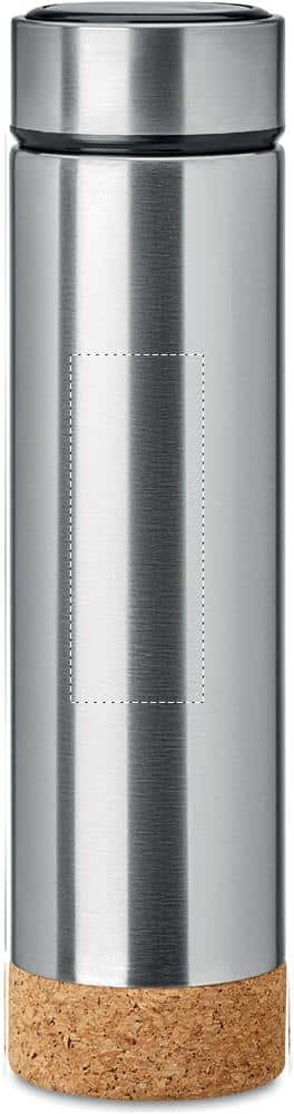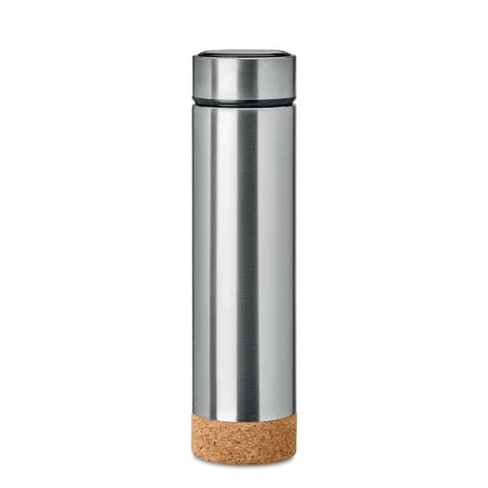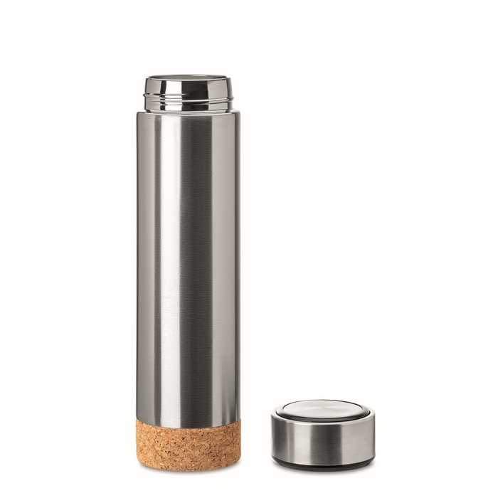 Double walled stainless steel insulating vacuum flask with additional tea infuser and cork base detail. Capacity 450 ml. Leak free.
