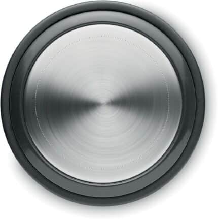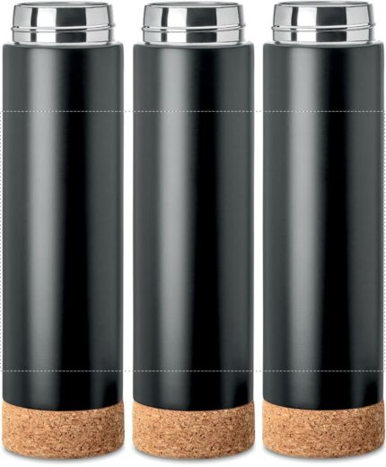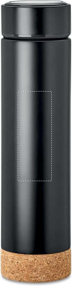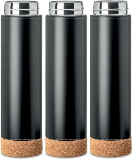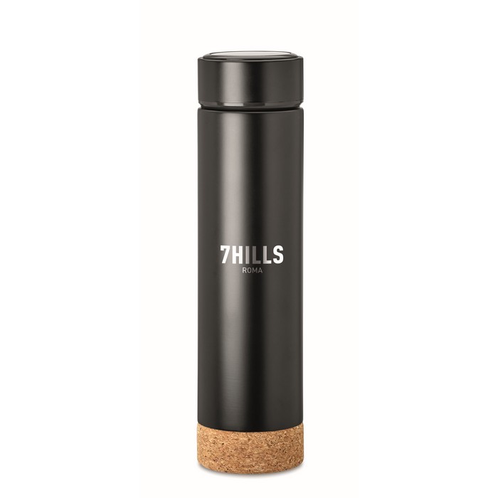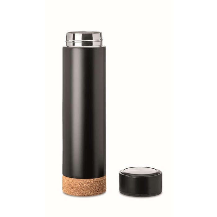 Double walled stainless steel insulating vacuum flask with additional tea infuser and cork base detail. Capacity 450 ml. Leak free.