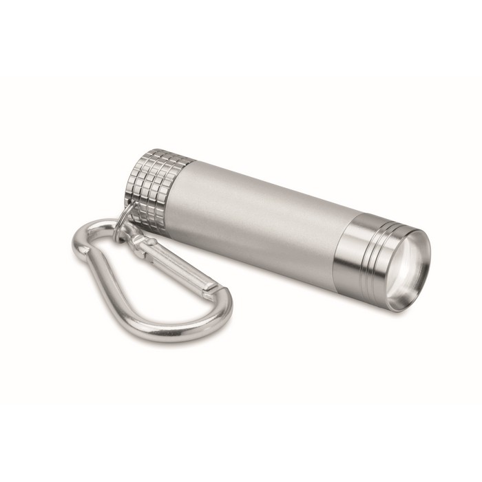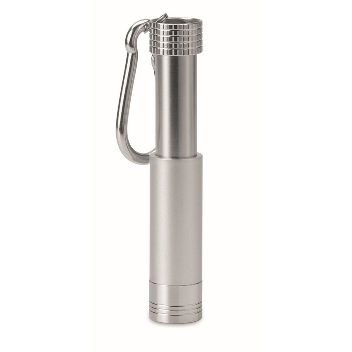Mini aluminium and ABS LED key ring. The logo can be laser engraved and the light will illuminate the logo. 4 LR44 batteries included.