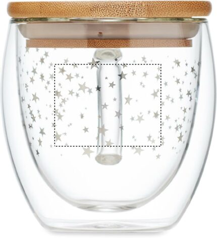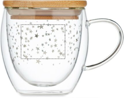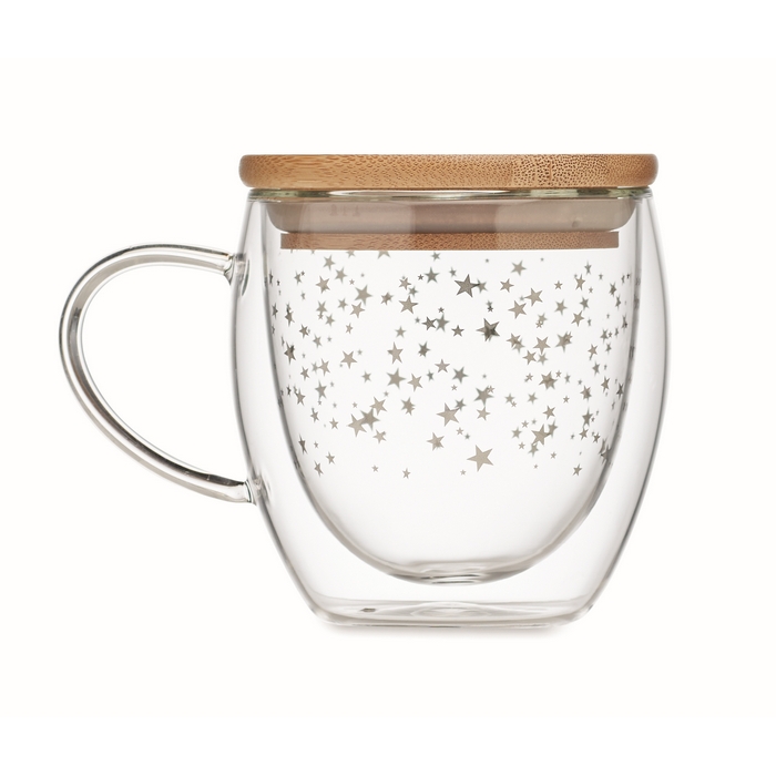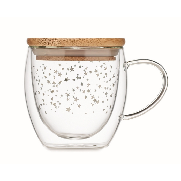 Το ποτήρι SION συνδυάζει κομψότητα και πρακτικότητα, φέροντας ένα μοναδικό διπλότοιχο σχεδιασμό από ανθεκτικό μποροσιλικάτο, διακοσμημένο με υπέροχα σχέδια αστεριών. Το καπάκι του ποτηριού, φτιαγμένο από φυσικό μπαμπού, προσθέτει μια οικολογική πινελιά και διασφαλίζει τη φρεσκάδα του περιεχομένου. Με χωρητικότητα 220 ml, το ποτήρι SION