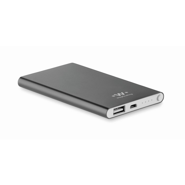 Power bank 4000 mAh in aluminium. Capacity for smartphone use, out put current DC5V/1A. Includes indicating light and USB cable with micro usb plug.
