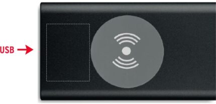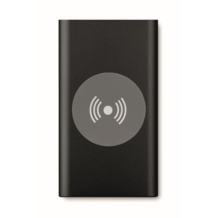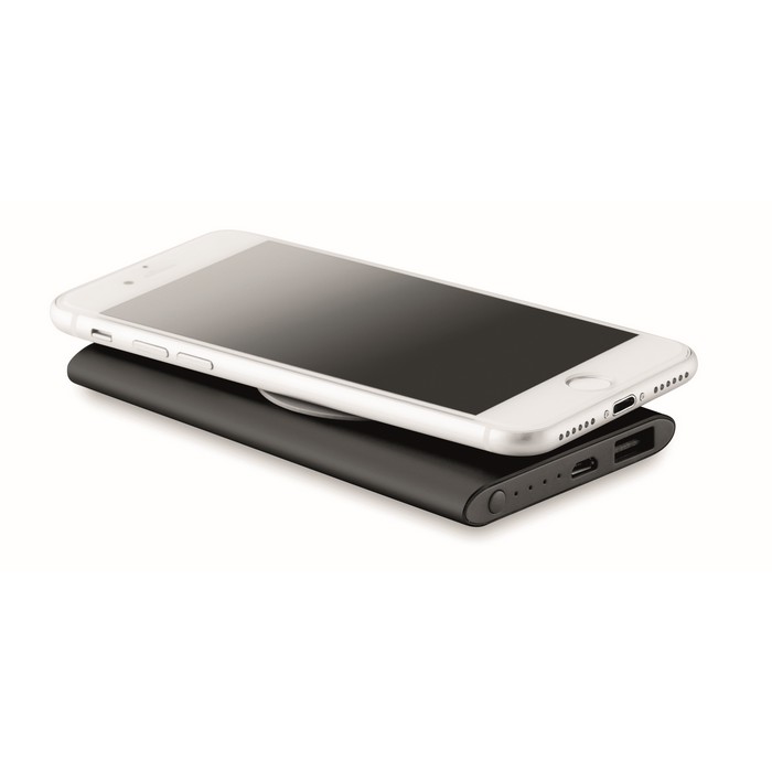 Wireless aluminium charging power bank with 4000 mAh capacity. Includes Type C connector. Output: DC5V/0.8A. Compatible latest androids, iPhone® 8, 8S and X and newer.