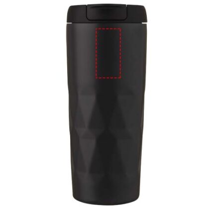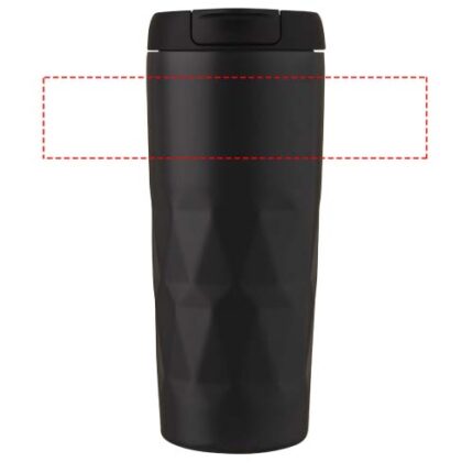Double-walled copper vacuum insulated tumbler with screw-on leakproof lid featuring an intricate geometric design. The insulated 18/8 stainless steel keeps drinks hot or cold for several hours. BPA-free and tested and approved under German Food Safe Legislation (LFGB), and tested for phthalates content according to REACH regulations. Volume capacity is 450 ml. Hand wash recommended. Presented in a recycled cardboard gift box.