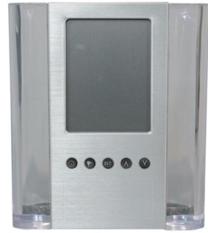 Penholder with calendar alarm clock and thermometer. 1 cell battery included.