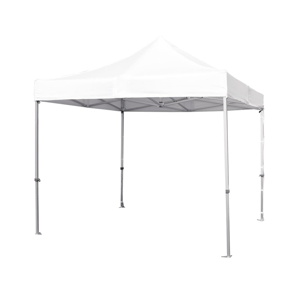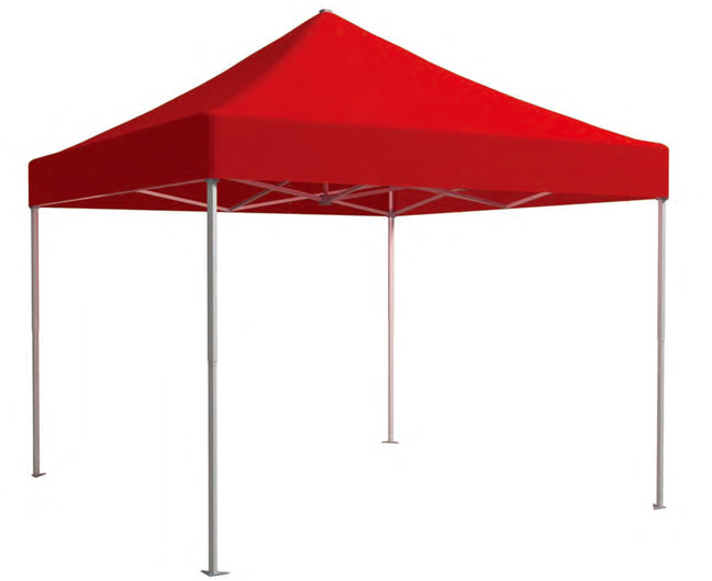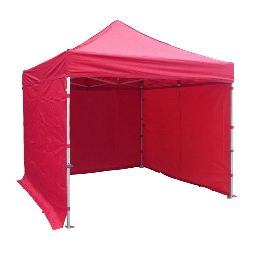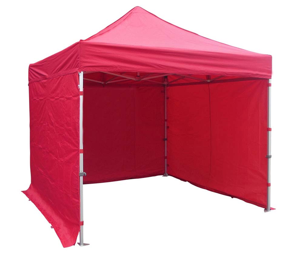 Folding Outdoor tent 3×3 mt. Durable aluminum frame (profile 40x40mm). With oxford fabric in white / red / blue color. Available as an option with fabric that covers the 3 sides (side and back). Easy installation.