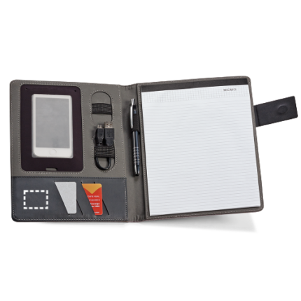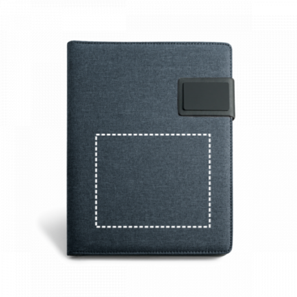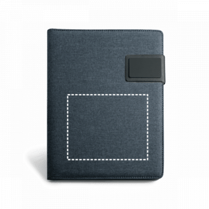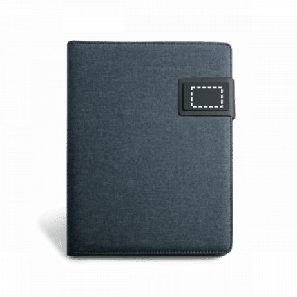 A5 imitation linen and imitation leather with magnetic closure. This folder includes a pad of 20 sheets of lined paper, support for ball pen (not included) and other compartments for accessories (not included). 183 x 252 x 18 mm | Plate: 50 x 30 mm