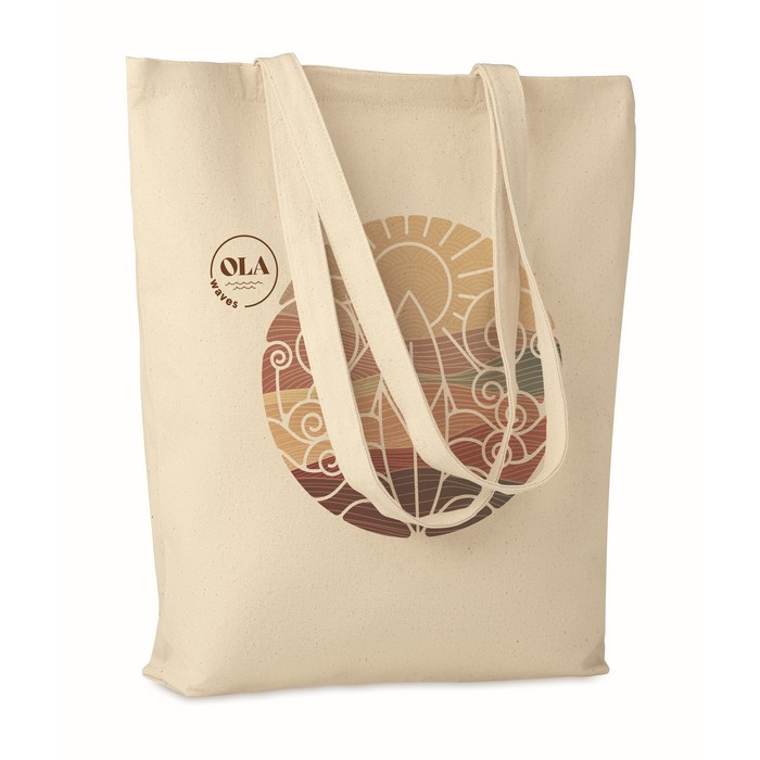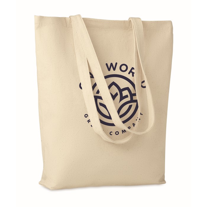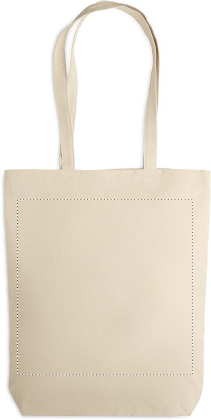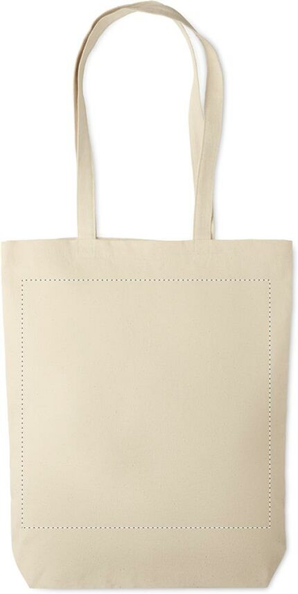 Canvas shopping bag with long handles and with bottom gusset. An ideal bag for your daily grocery shopping. The long handles make it easy to carry it by either holding it or hanging it over your shoulder. This canvas tote has a base gusset so you can carry more items than with a regular shaped bag. 270 gr/m².