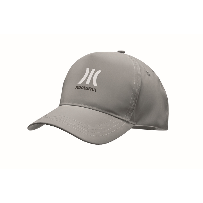 5 panel baseball cap in high reflective 190T polyester. 4 stitched eyelets with hook and loop closure. Size 7 1/4.