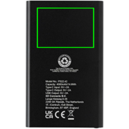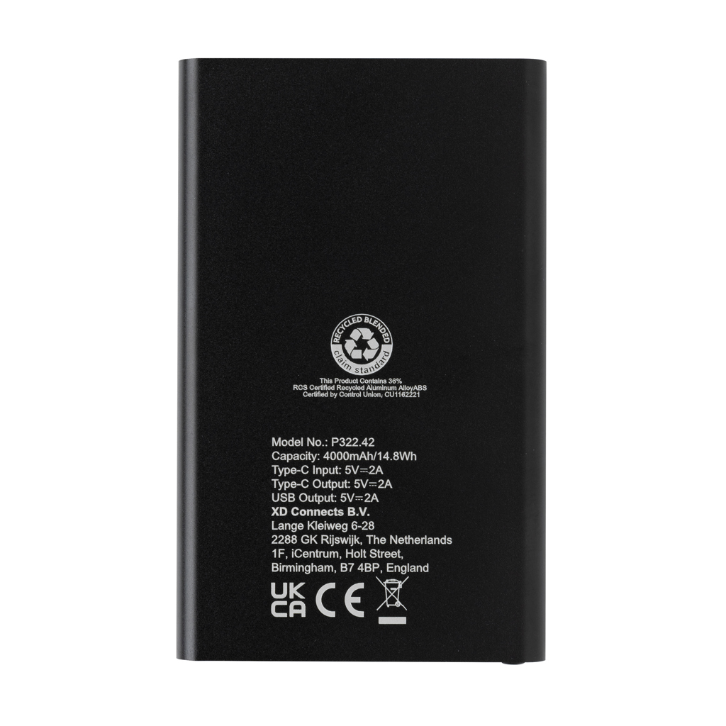 4.000 mAh flat design powerbank with a the case made out of RCS certified recycled Aluminum/ABS plastic. RCS (Recycled Claim Standard) is a standard to verify the recycled content of a product throughout the whole supply chain. Total recycled content: 36 % based on total item weight. The powerbank supports both charging via USB A as well as type C. The powerbank contains a long lasting grade A 4.000 mAh lithium polymer battery. The power indicators will indicate the remaining energy level so you always know when to re-charge.; Type-C Input 5V/2A; Type C output:5V/2A USB A output: 5V/2A. Item and accessories PVC free. Including RCS certified recycled TPE charging cable. Packed in FSC® mix packaging.