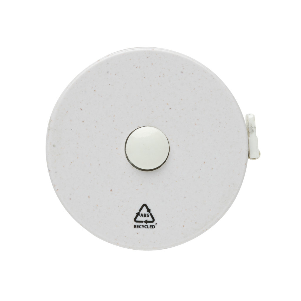 1.5m/60inch recycled plastic tape with return push button, for fitness and fashion. The case is made out of RCS certified recycled ABS plastic, fibreglass and FSC® 100% bamboo. Total recycled content: 64% based on total item weight. RCS certification ensures a completely certified supply chain of the recycled materials. The tape is 8mm wide and retractable by button. Packed in FSC® mix packaging.