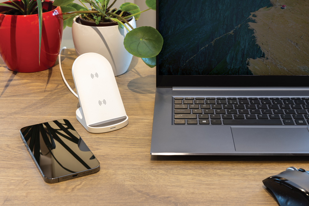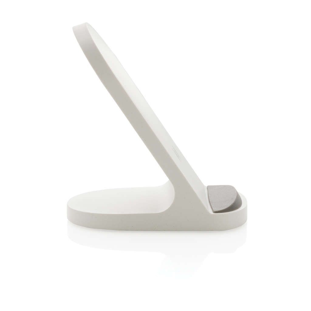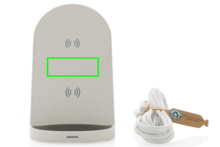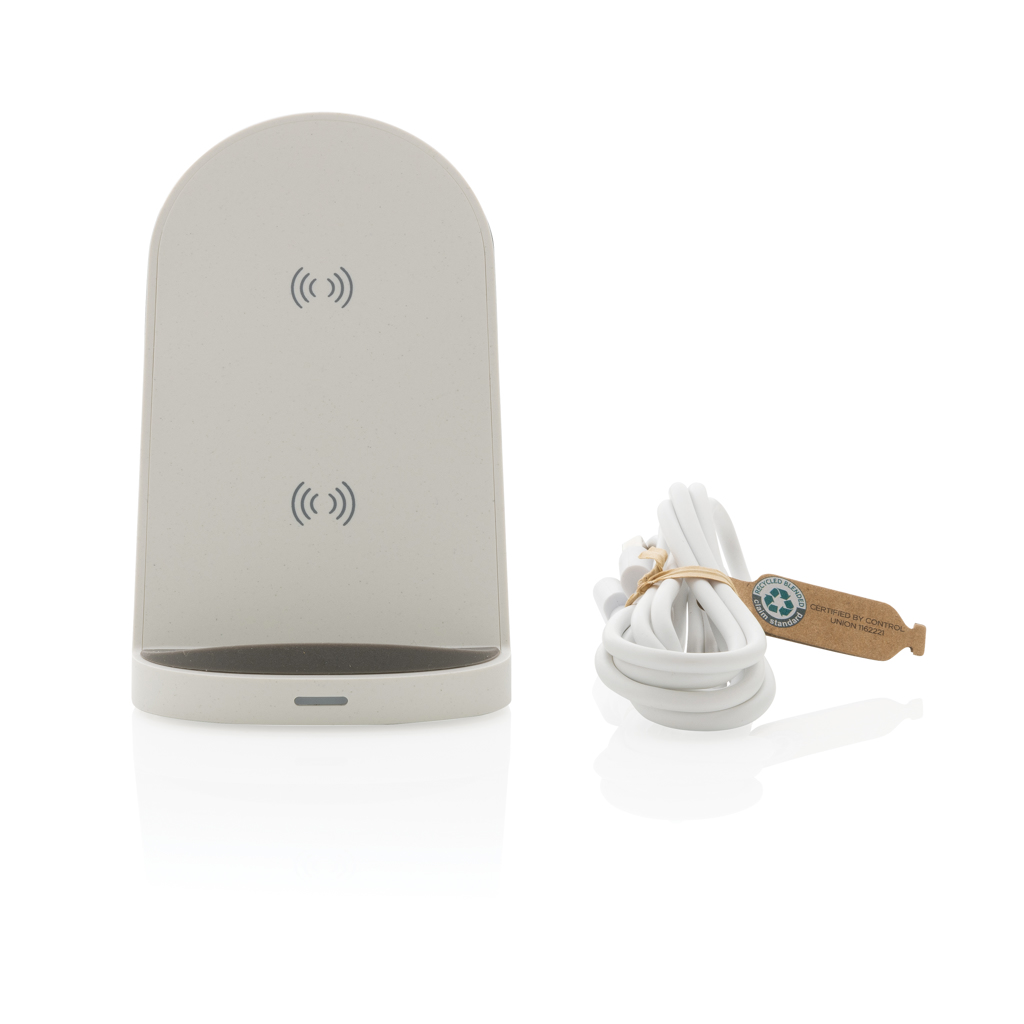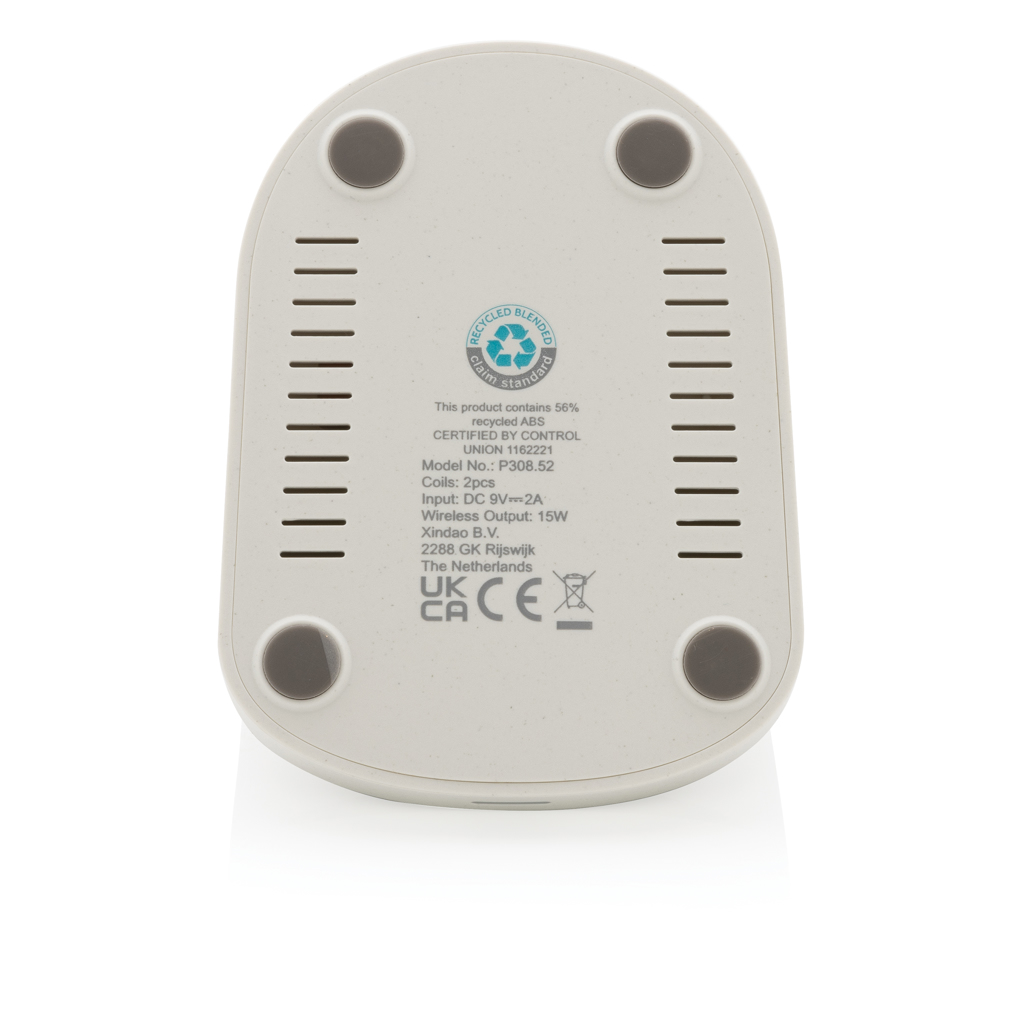 15W wireless fast charger stand with two integrated charging coils. The stand supports both horizontal as well as vertical charging. Made with RCS (Recycled Claim Standard) certified recycled materials. Total recycled content: 56% based on total item weight. RCS certification ensures a completely certified supply chain of the recycled materials. Including 150 cm PVC free recycled TPE material charging cable. ; Item and accessories 100% PVC free. Packed in FSC mix packaging. Wireless charging compatible with Android latest generations, iPhone 8 and up. Input: 12V/1.67A. Wireless Output: 9V/1.5A 15W.