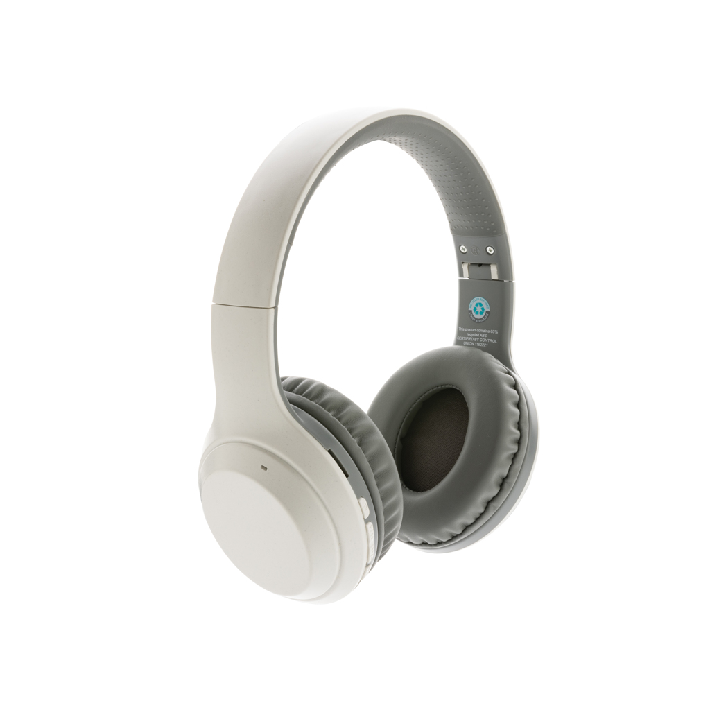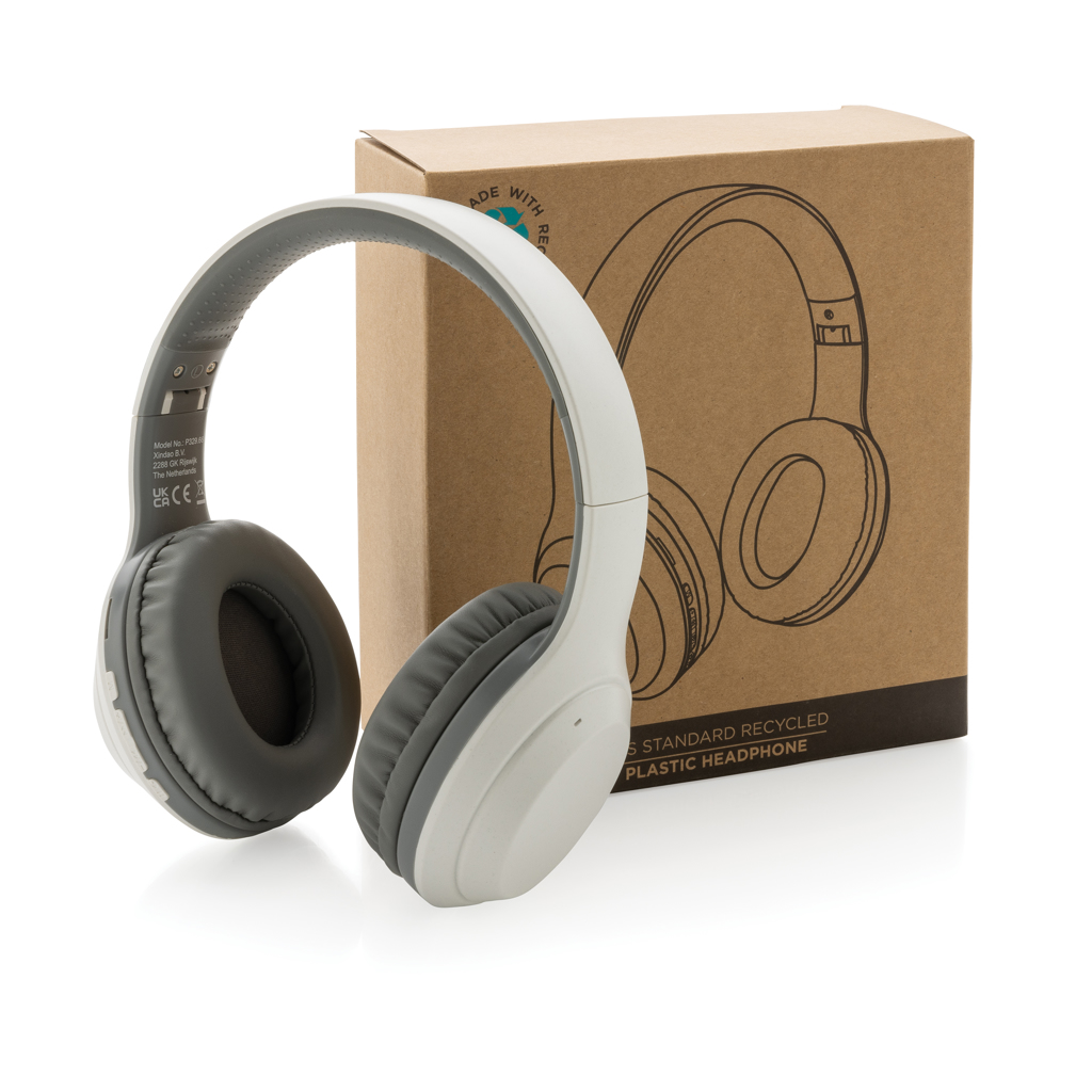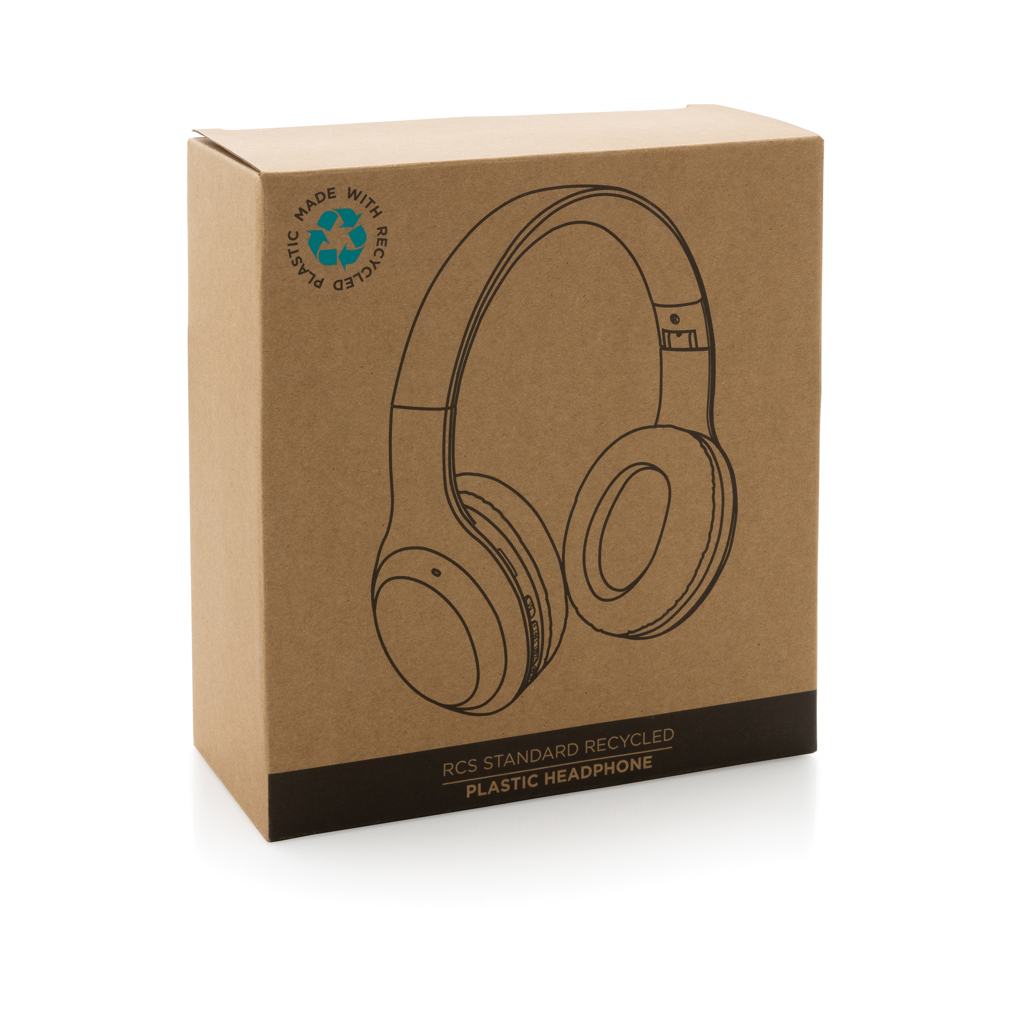 Foldable wireless headphone where the case is made out of RCS certified recycled ABS plastic. RCS (Recycled Claim Standard) is a standard to verify the recycled content of a product throughout the whole supply chain. Total recycled content: 65% based on total item weight. The wireless headphone uses BT 5.0 for super smooth connection and long lasting play-time. The over ear design of the earbuds allows a perfect sound experience. The built-in 200 mAh lithum battery allows a play time up to 6 hours and can be fully re-charged in 1.5 hours. Operating distance up to 10 metres. With mic and pick up function. Item and accessories are PVC free. Including PVC free recycled TPE material charging cable.