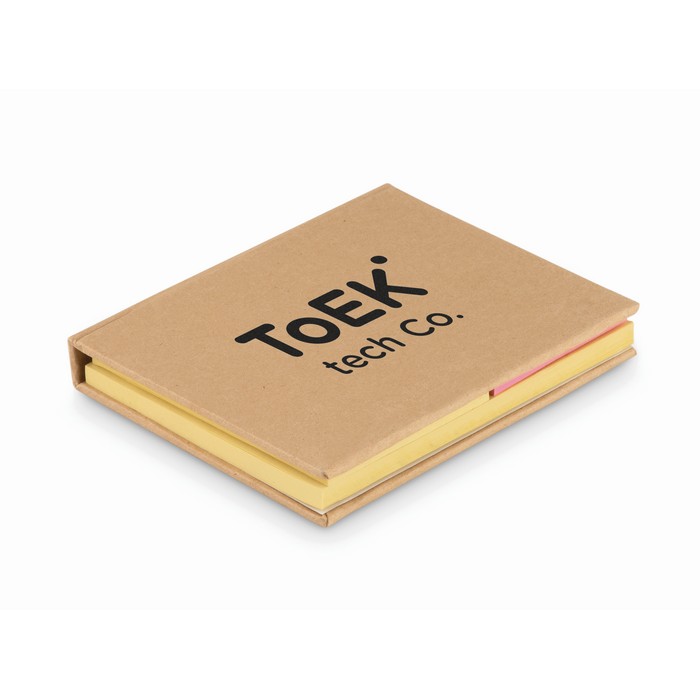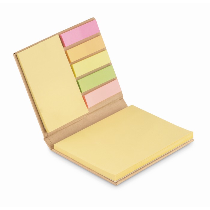 3 piece sticky note memo pad with recycled carton cover. Large and medium yellow sticky notes pads and 5 assorted colours page markers.