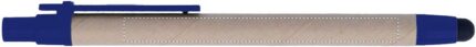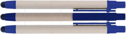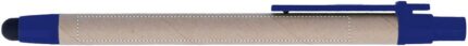 Push ball pen made with recycled carton barrel and ABS point and clip. Blue ink, refill and soft touch tip.
