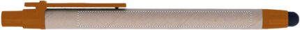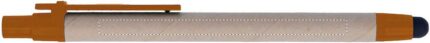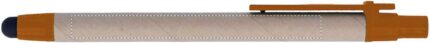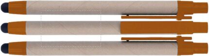 Push ball pen made with recycled carton barrel and ABS point and clip. Blue ink, refill and soft touch tip.