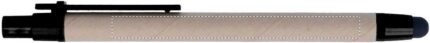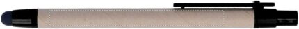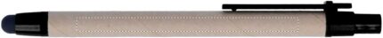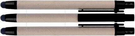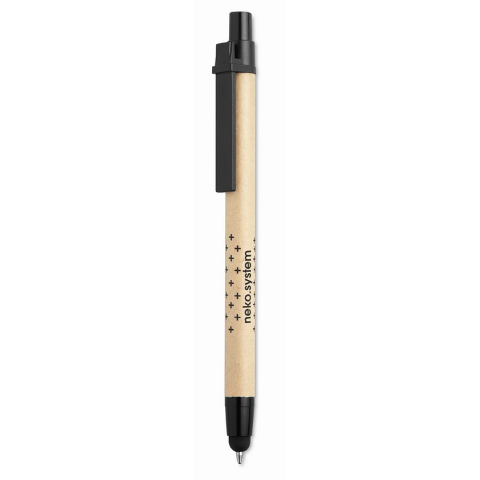 Push ball pen made with recycled carton barrel and ABS point and clip. Blue ink, refill and soft touch tip.