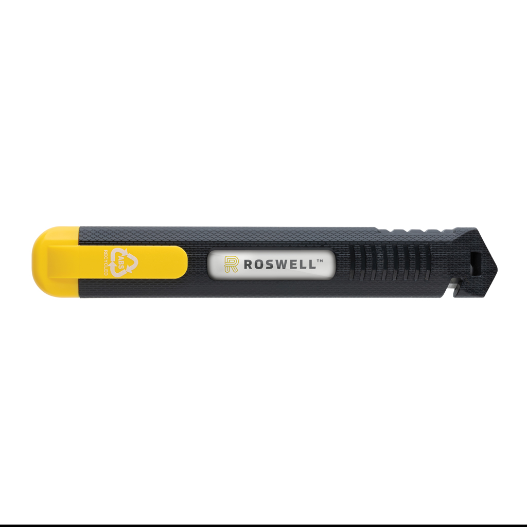 Refillable RCS certified recycled plastic snap-off knife made with RCS (Recycled Claim Standard) certified recycled ABS and stainless steel blade. Total recycled content: 78% based on total item weight. RCS certification ensures a completely certified supply chain of the recycled materials. This versatile knife features a snap-off blade design, allowing you to easily replace the SK4 blade when it becomes dull. Whether you need to cut through cardboard, plastic, or even thin sheets of metal, the snap-off knife is up to the task. The sharp, durable blade ensures that you’ll get clean, precise cuts every time. The knife is also incredibly easy to use. The comfortable handle provides a secure grip, allowing you to maintain complete control as you cut. Plus, the lightweight design makes it easy to carry with you wherever you go. Packed in FSC® mix kraft package. The item comes with 1 blade inside the item and two extra blades.