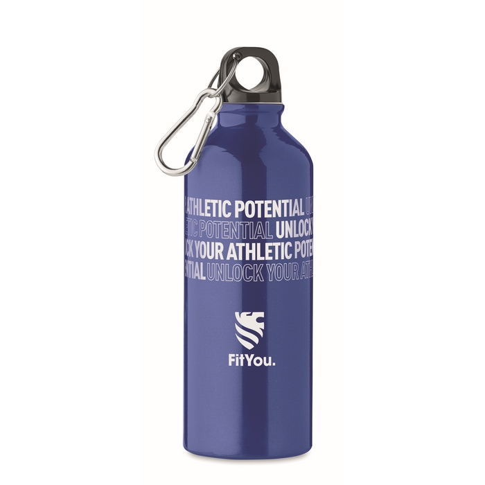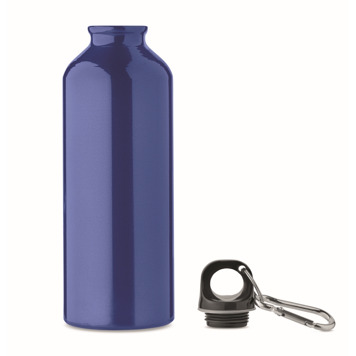 Single wall recycled aluminium bottle with carabiner. Capacity: 500 ml. Leak free. The carabiner is not for climbing (non professional use). Sublimation print available on white item only.