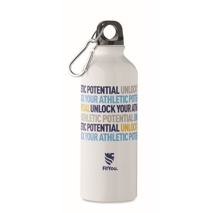 Single wall recycled aluminium bottle with carabiner. Capacity: 500 ml. Leak free. The carabiner is not for climbing (non professional use). Sublimation print available on white item only.