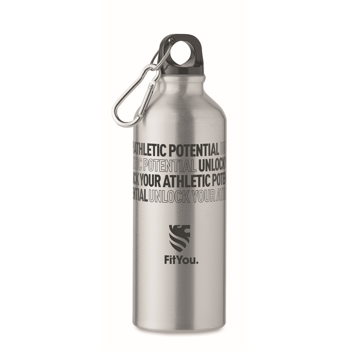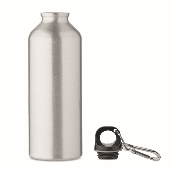 Single wall recycled aluminium bottle with carabiner. Capacity: 500 ml. Leak free. The carabiner is not for climbing (non professional use). Sublimation print available on white item only.