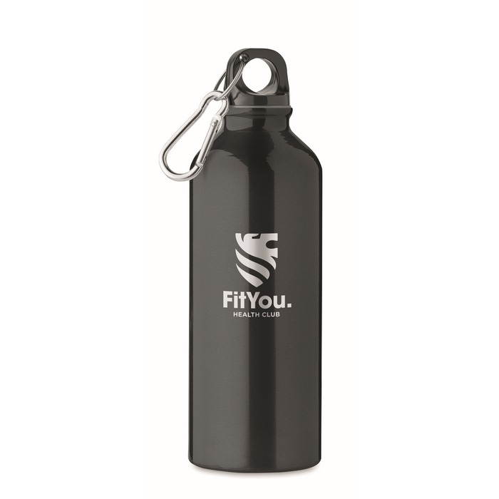 Single wall recycled aluminium bottle with carabiner. Capacity: 500 ml. Leak free. The carabiner is not for climbing (non professional use). Sublimation print available on white item only.