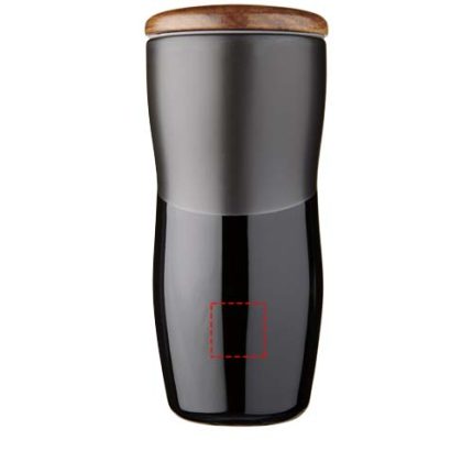 Double-wall ceramic tumbler with matte & shiny contrast design. The double wall ceramic construction also prevents condensation on the outside of the tumbler. Features a push-on wooden lid. Dishwasher safe in accordance with EN12875-1 (at least 125 washing cycles) for all decoration methods. Volume capacity is 370ml. Presented in an Avenue gift box.